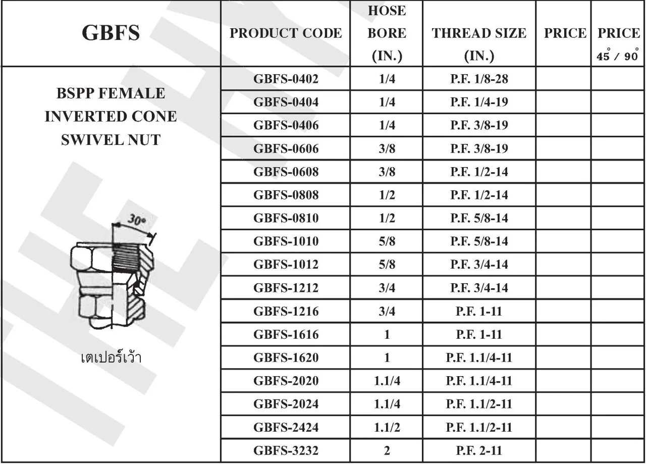 ประเภทหัวสาย: 30° Flare BSPP Swivel (หัวเว้า)